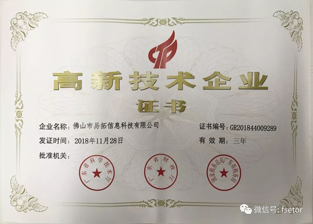 喜报!喜报!2019年5月9日,经广东省科学技术厅评定推选、国家科技部复核,佛山市易拓信息科技有限公司荣获“高新技术企业”证书,由此正式迈入国家高新技术企业行列。